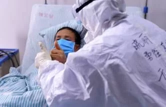 2020年2月6日,璧山区人民医院感染疾病科隔离病房里党员刘晓丽与患者点赞互相鼓励。胡悦建摄