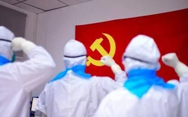 2020年2月6日,璧山区人民医院感染疾病科隔离病房成立临时党支部,6名党员在党旗前重温入党誓词。胡悦建摄