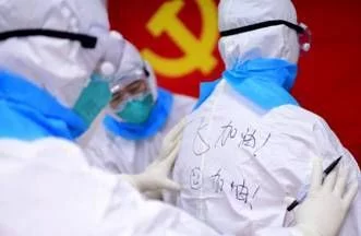 2020年2月6日,璧山区人民医院感染疾病科隔离病房的党员同志在隔离服背后为彼此写名字,相互鼓励,坚定共同抗击疫情的决心。胡悦建摄
