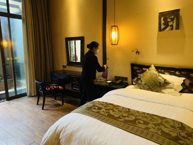 “在酒店客房内,顾客接触到的用具也会进行全面消毒”李应锋说,针对顾客退房后,还会进行双重消毒清洁保障,全面消毒后开窗通风至少24小时,再进行二次卫生清理与消毒。此外,天赐华汤酒店还采取了控流量、防聚集、严防护的举措,票务购买必须网上下单,减少不必要的接触;火锅方面不能同时接待堂食超过3桌,对每桌至少登记1名就餐客人的身份信息和有效联系方式。