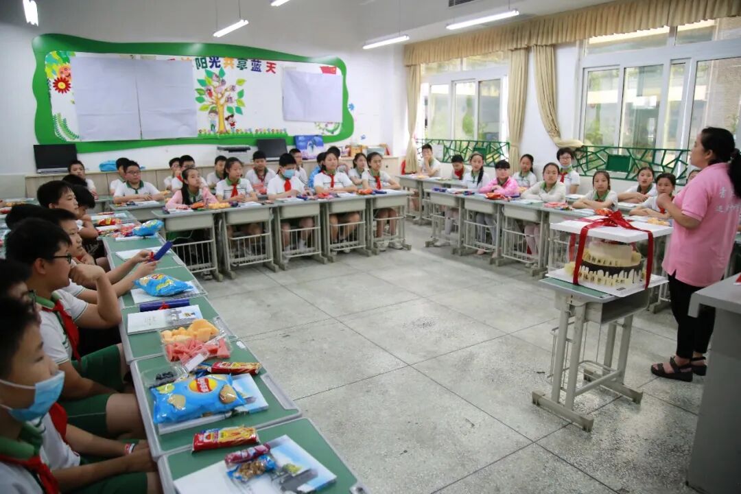 瞧,那阳光明媚的教室,毕业影集里留存着青雅童年的点点滴滴;沉默无语的黑板诉说着我们的不舍,蛋糕载满同伴的祝福、老师的期待;五彩的气球,热情的拥抱,笑声处处飘荡……